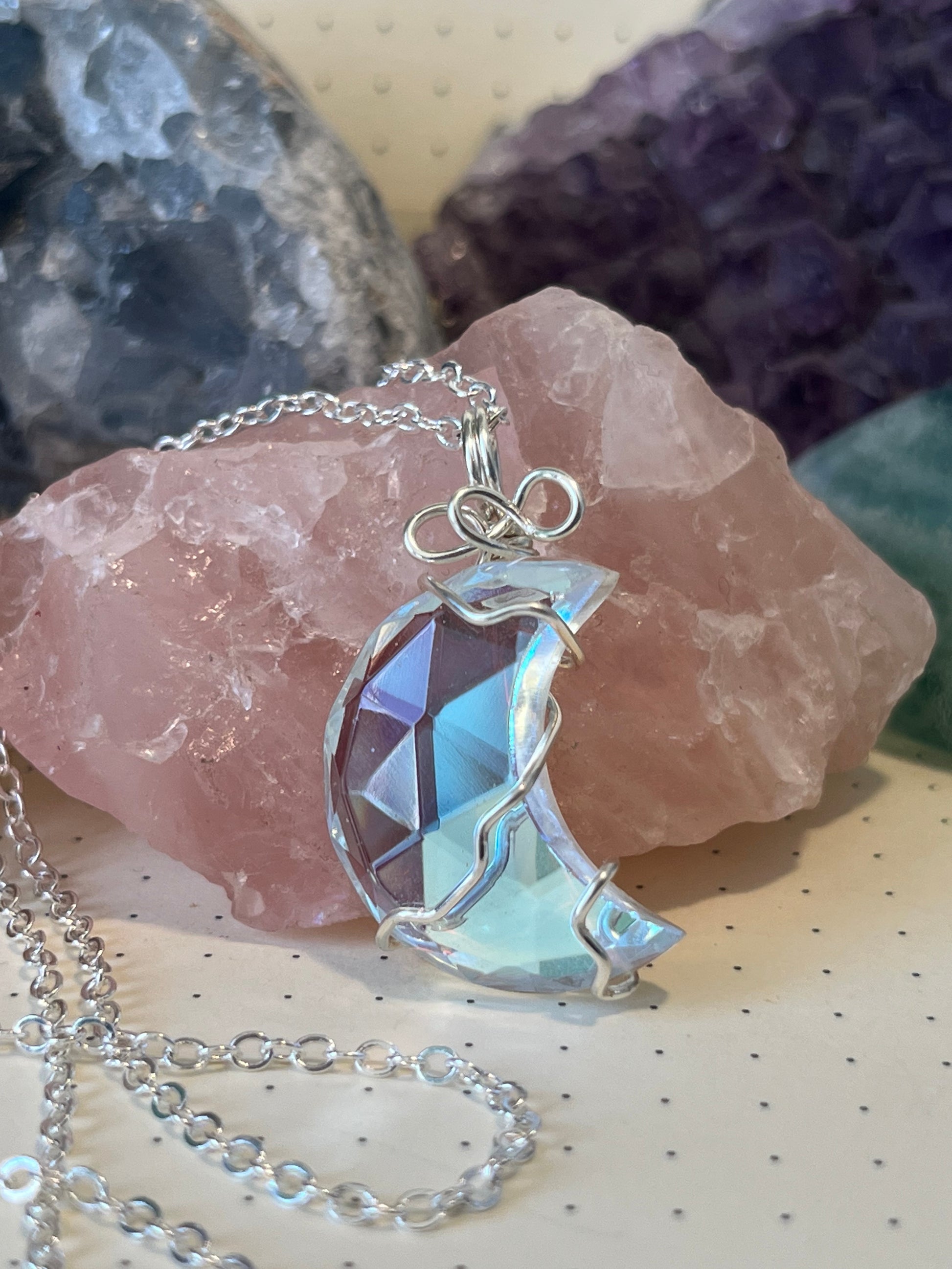 Aura Quartz Moon Necklace | Wire Wrapped Crystal Healing Pendant with Chain | Joy ~ Happiness ~ Healing