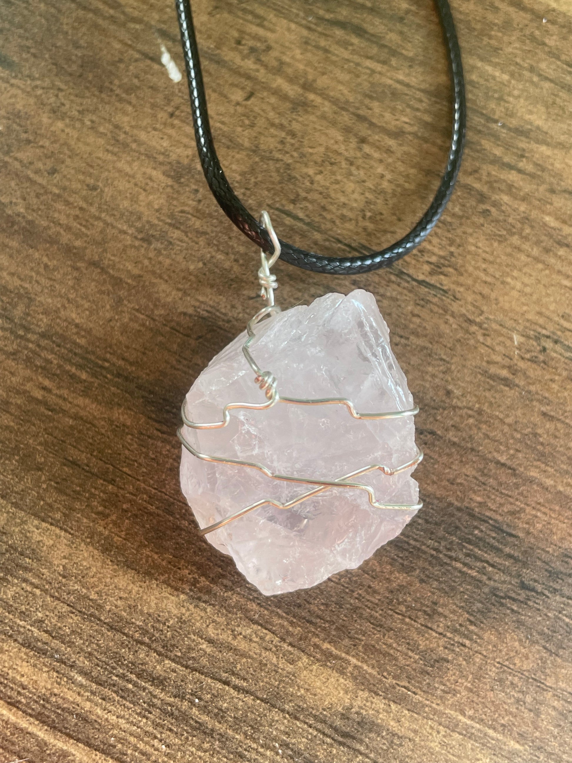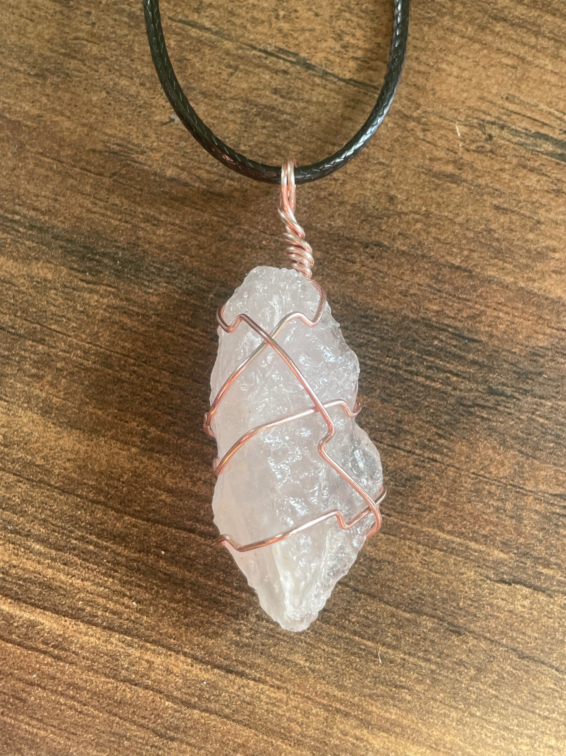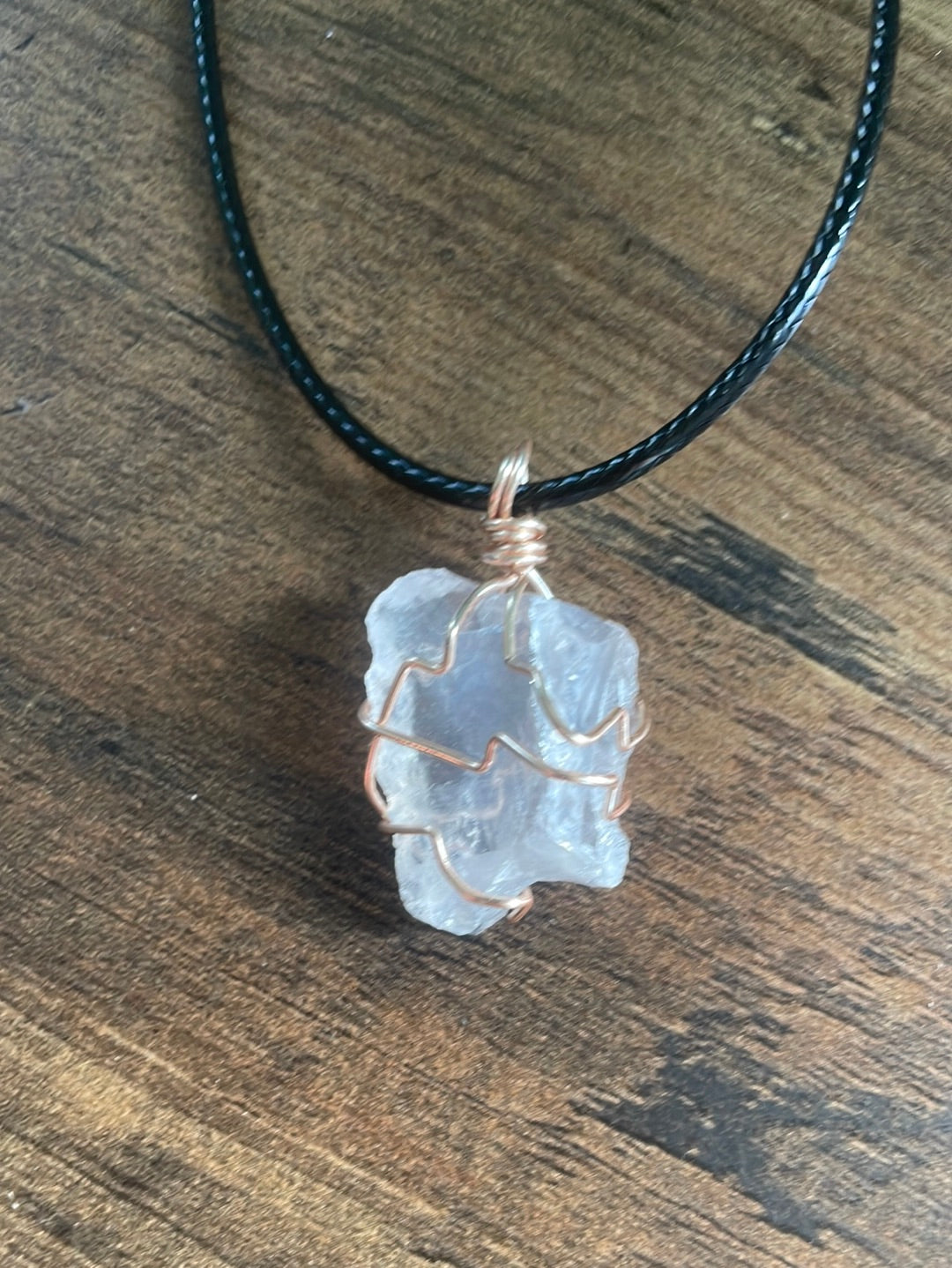Raw crystal quartz are wire wrapped in your choice of color wire and strung with a 24 inch black cord with adjustable clasp. Crystals available are Clear Quartz, Green Quartz & Rose Quartz. Wire available: Copper, Silver plated, and Rose gold plated.