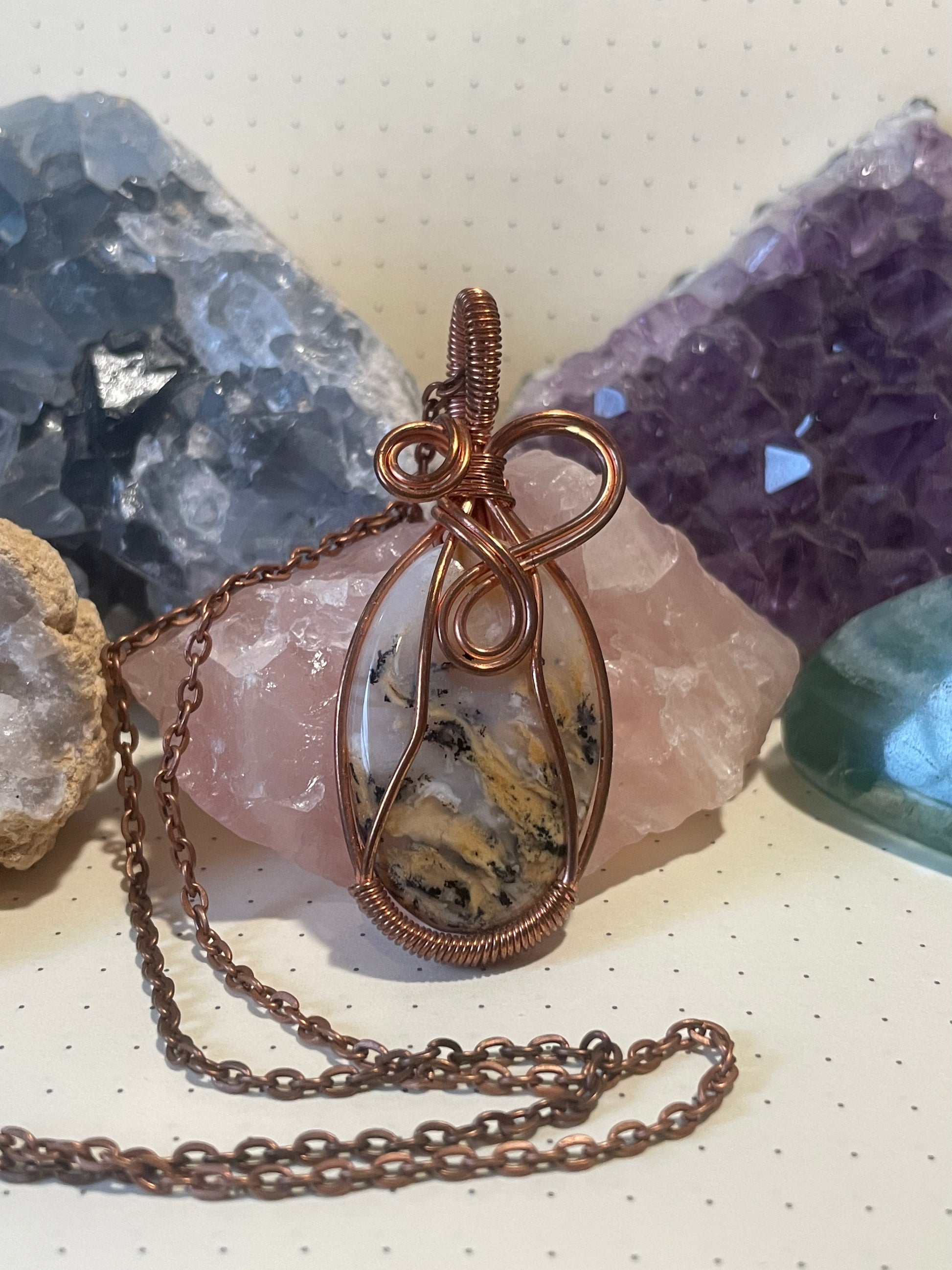 This handmade wire wrapped pendant is made with silver plated copper wire and natural crystals that are chosen individually for each specific healing energy. While creating each piece, I concentrate on charging each crystal with the corresponding healing energy and placing intention to help whomever this piece was meant to be created for. When finished, each crystal pendant is cleansed with incense and then charged in the Sunlight and Moonlight. Each pendant comes with a chain.