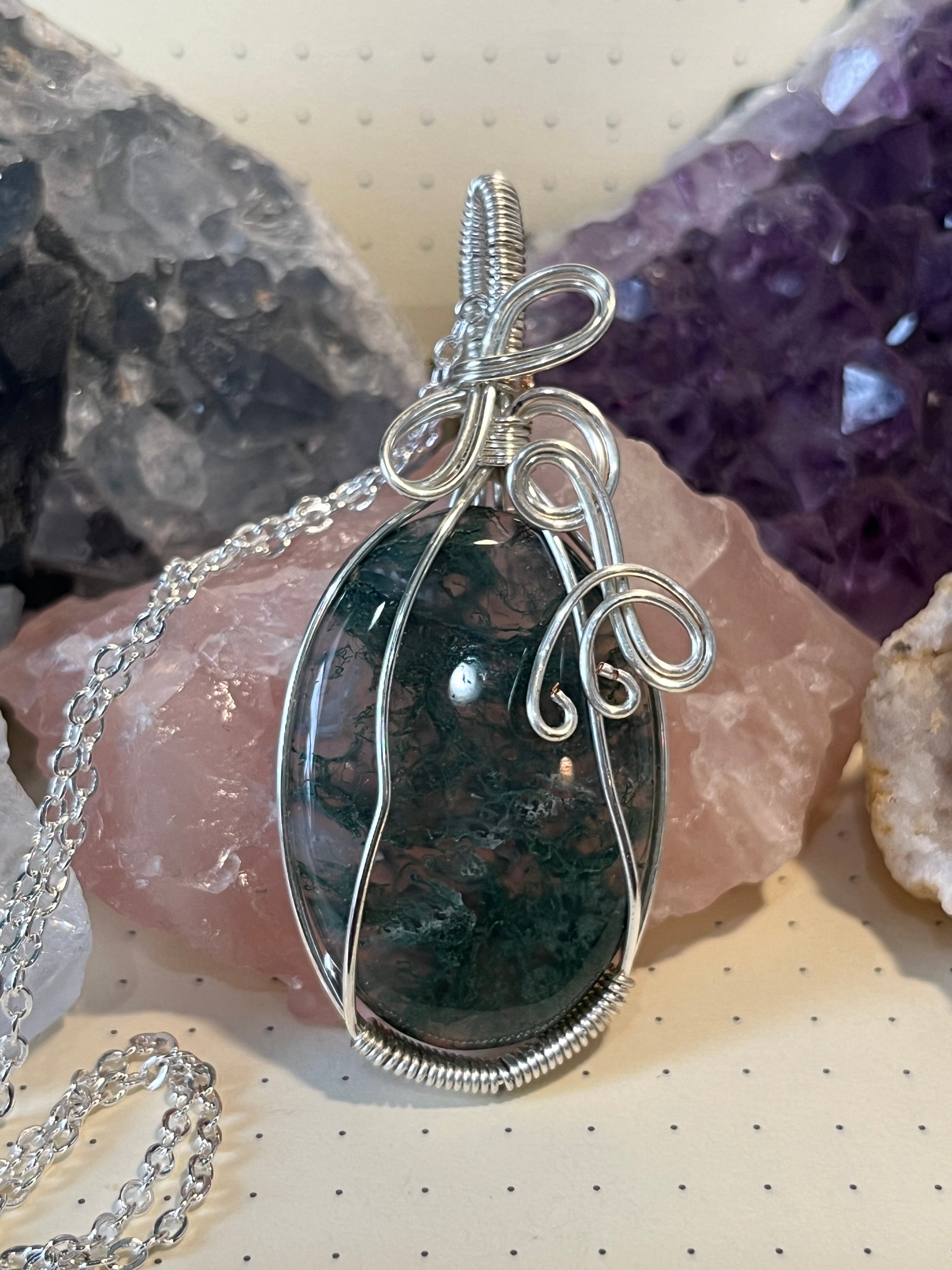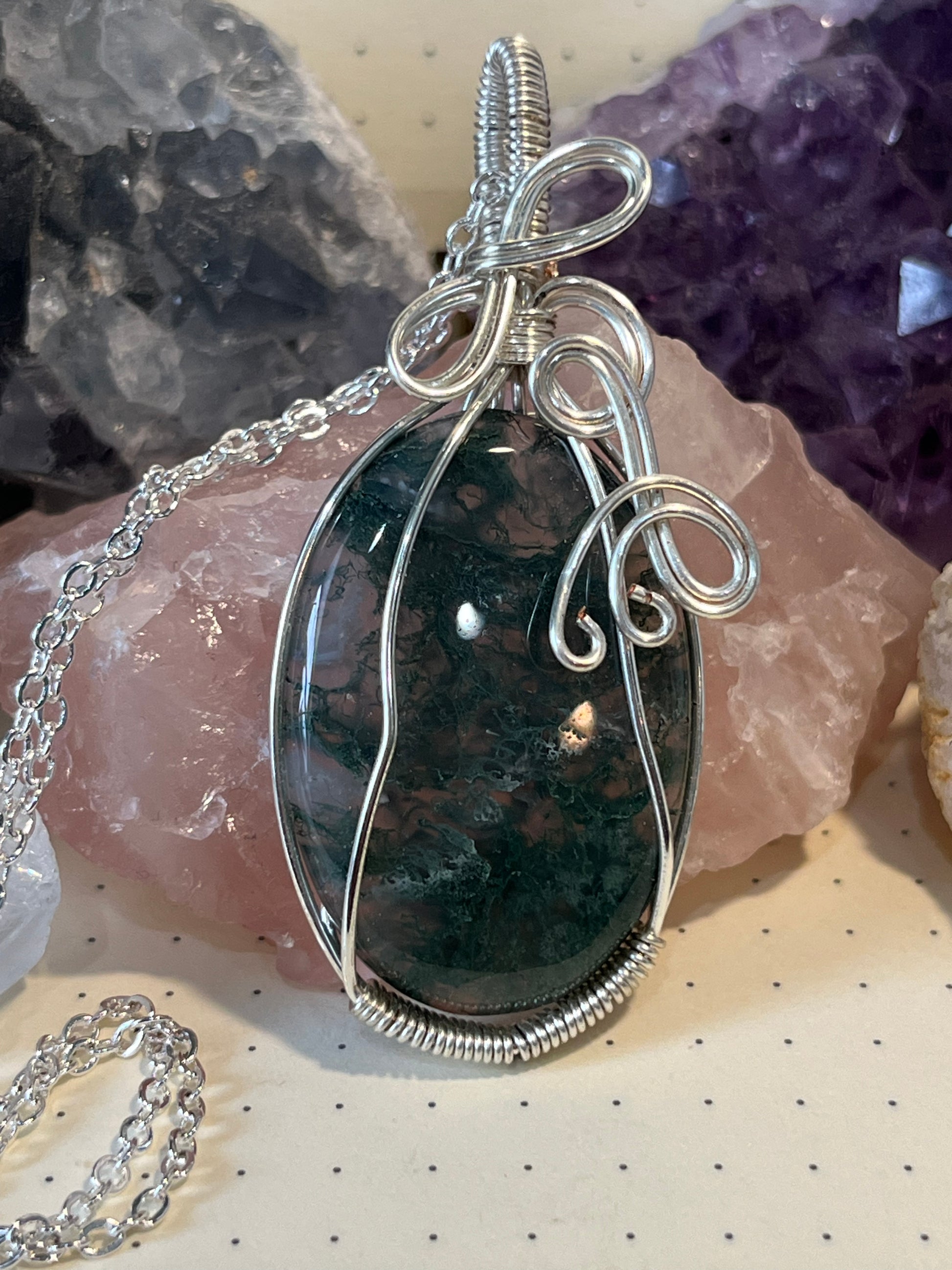 Green Moss Agate Necklace, Wire Wrapped Crystal Pendant with Chain, Grounding - Connecting with Nature - Peace