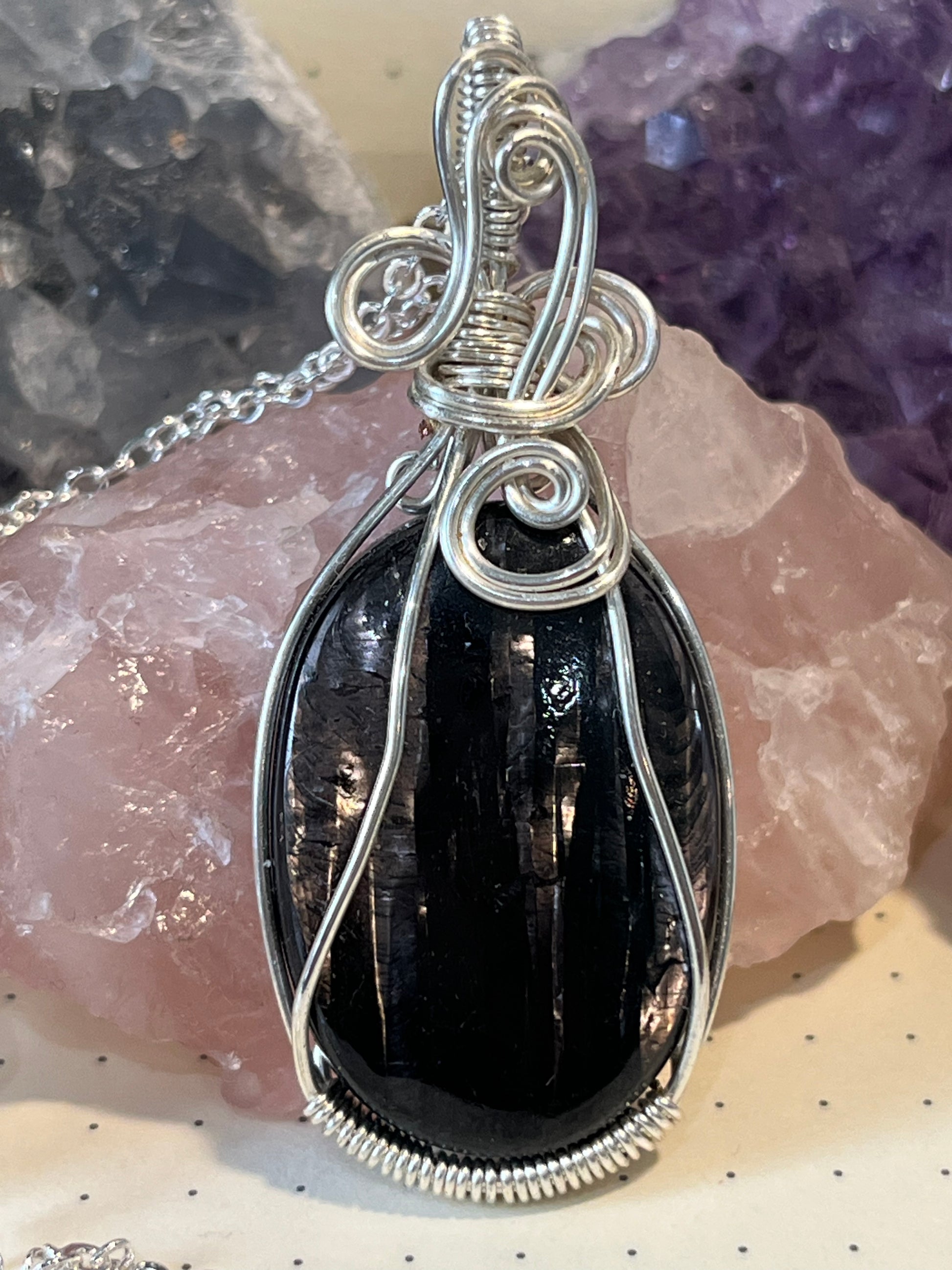 Hypersthene Necklace, Wire Wrapped Crystal Pendant with Chain, Grounding ~ Self-Acceptance ~ Meditation
