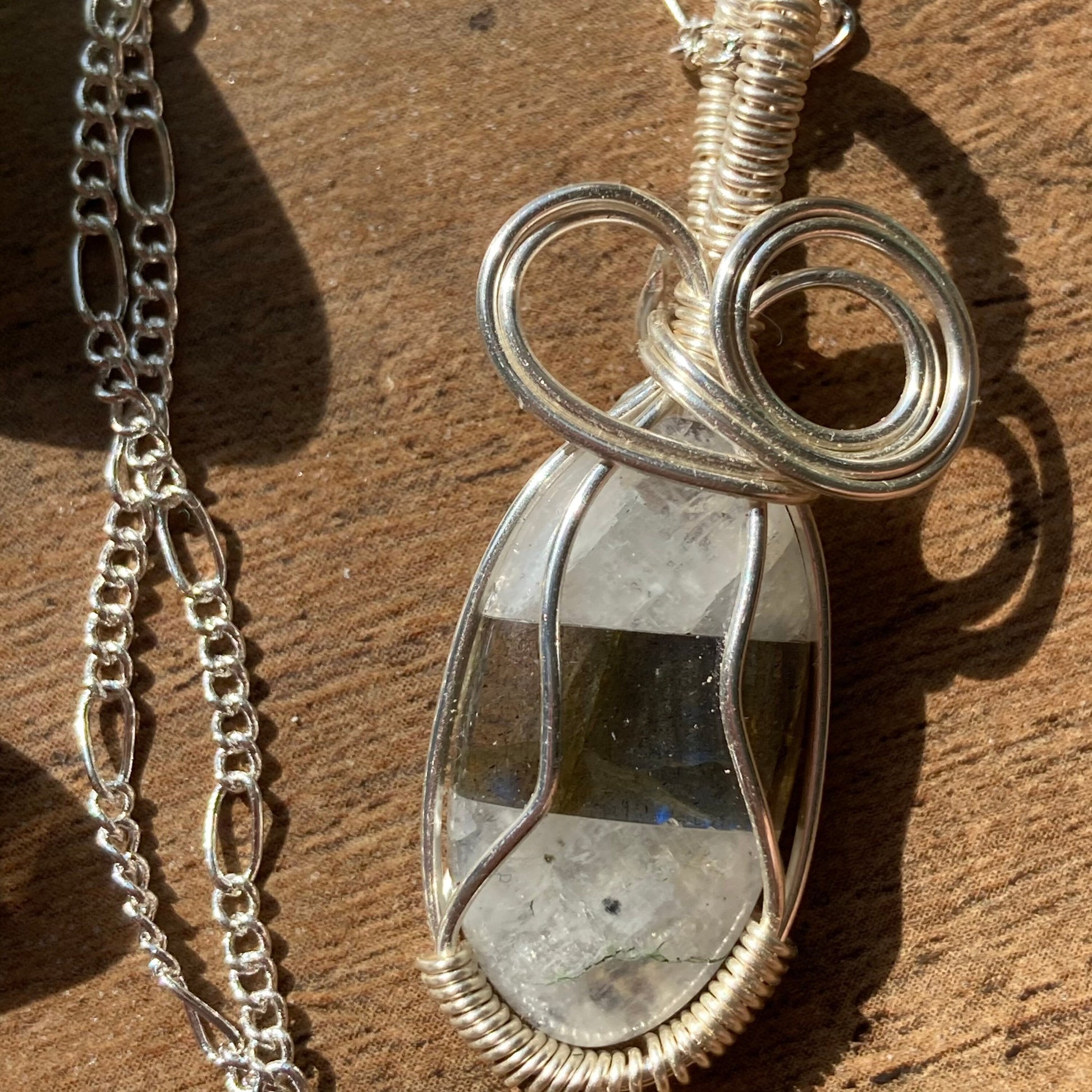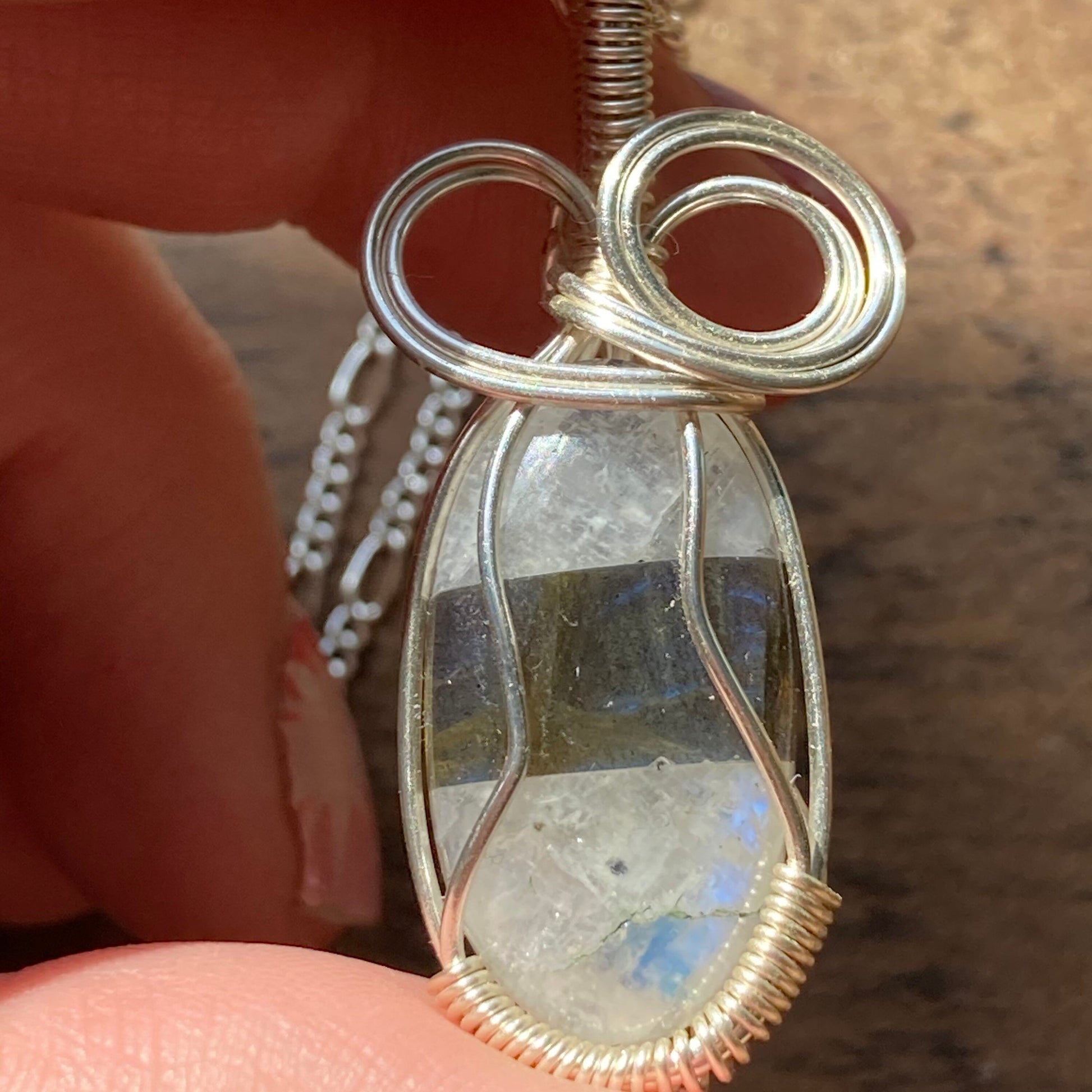 Labramoon Necklace, Wire Wrapped Crystal w/ Chain, Moonstone & Labradorite w/ flash, Higher Awareness ~ Soothing ~ Develops Psychic Gifts