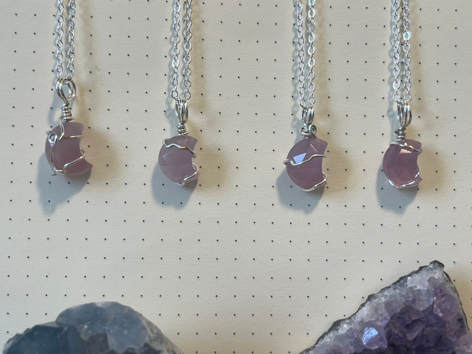 Lavender Chalcedony Moon Necklace | Wire Wrapped Crystal Healing Pendant with Chain | Happiness ~ Energizing ~ Balance