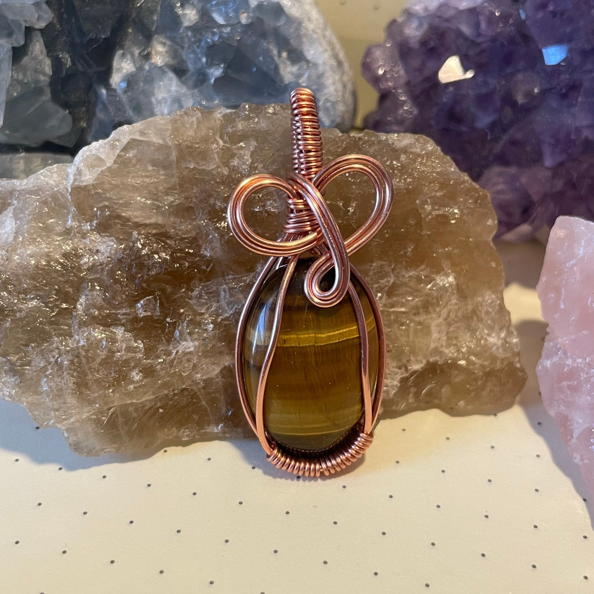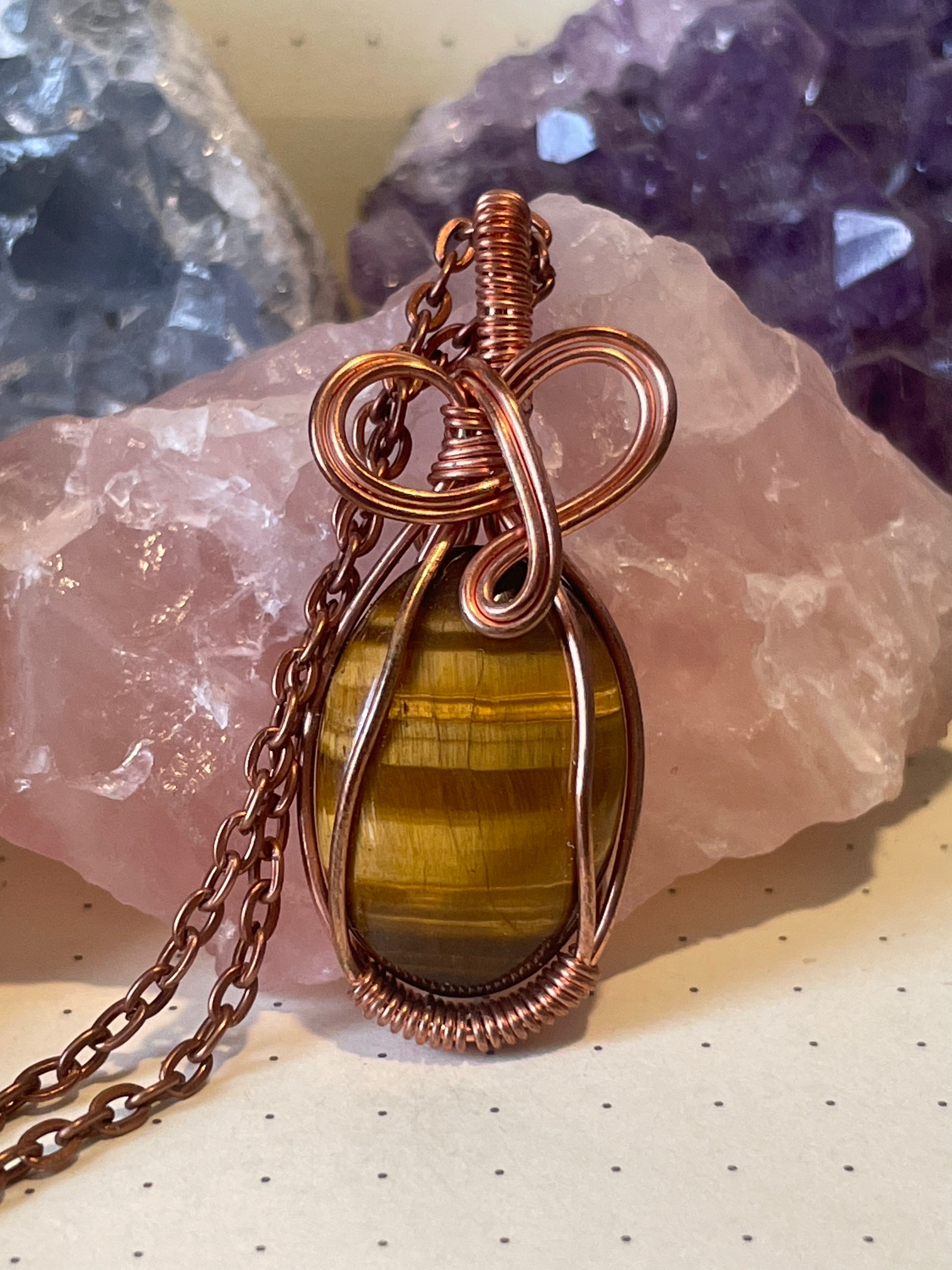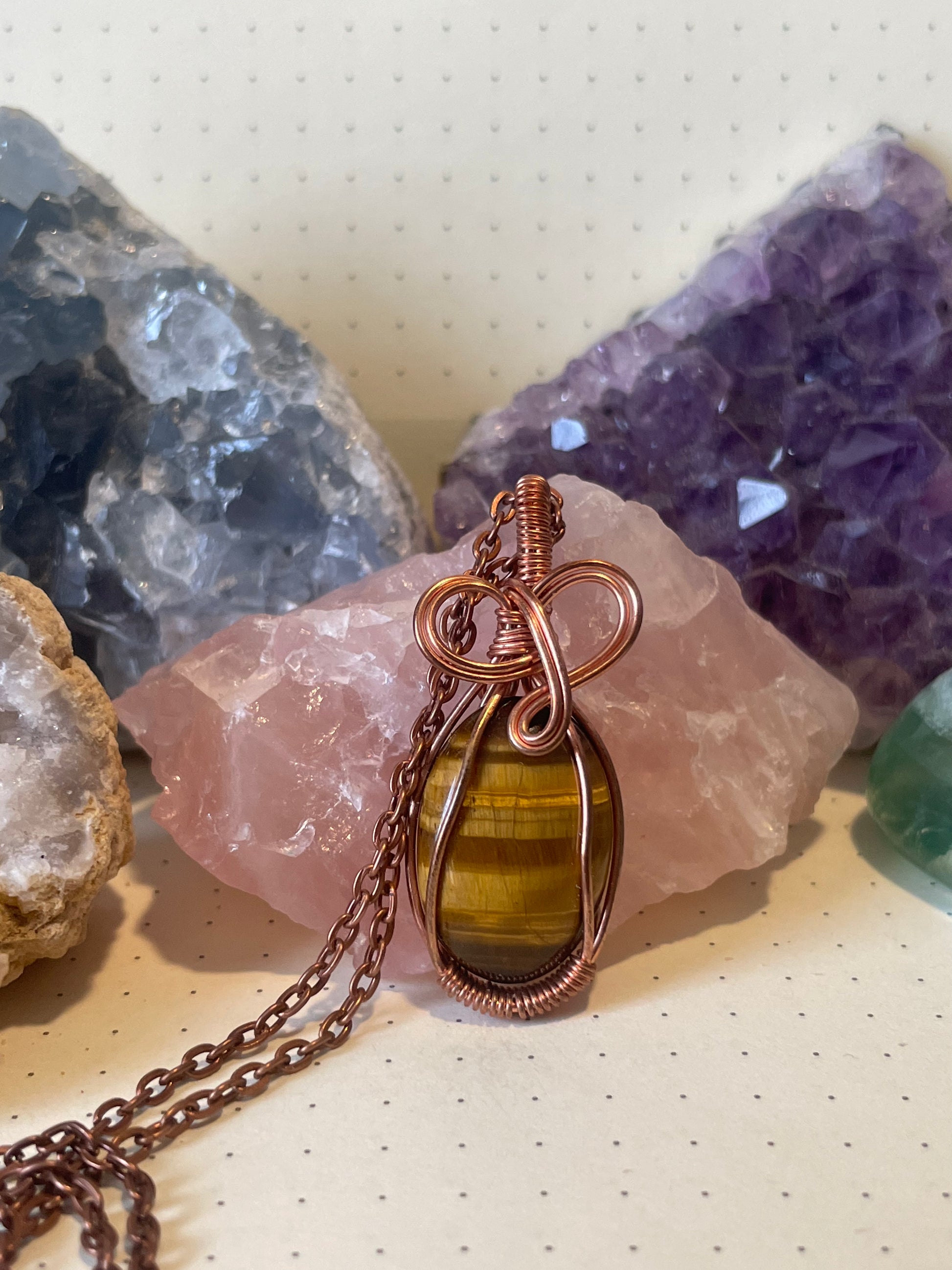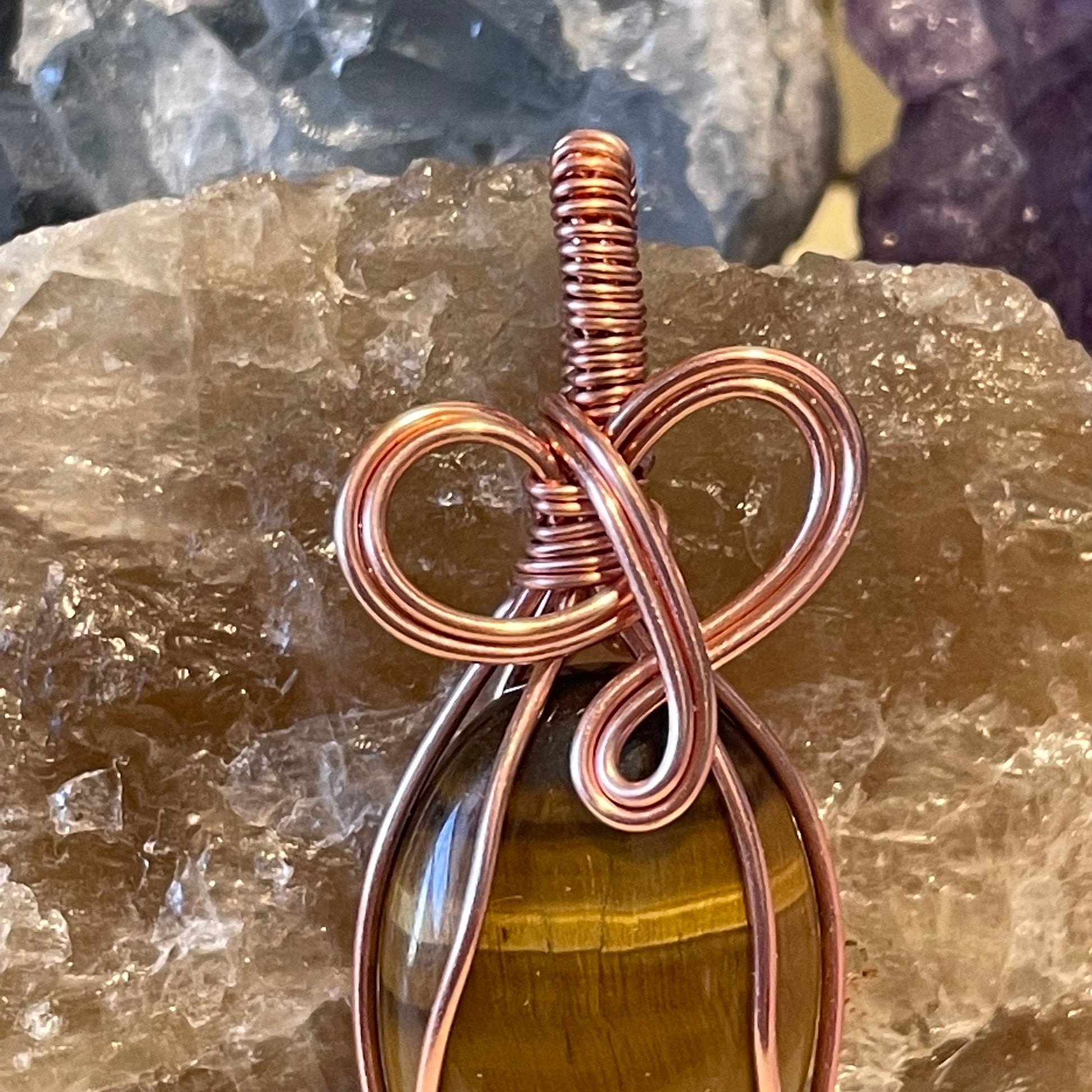 This handmade wire wrapped pendant is made with copper wire and natural crystals that are chosen individually for each specific healing energy. While creating each piece, I concentrate on charging each crystal with the corresponding healing energy and placing intention to help whomever this piece was meant to be created for. When finished, each crystal pendant is cleansed with incense and then charged in the Sunlight and Moonlight before being sent to you.